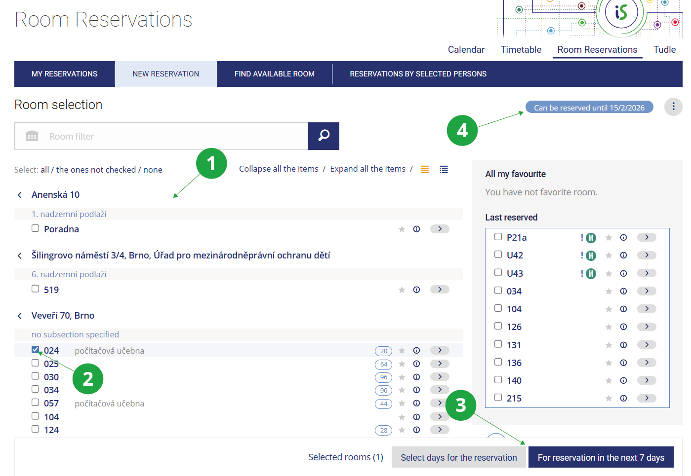 Here, the user will find a list of rooms they are authorized to reserve. These are rooms where the user is listed in the Contact Information or which are marked with one of the attributes 'Smí rezervovat' ('reservations allowed for'), 'Smí rezerv. učo' ('reservation allowed for the personal identification number'), 'Smí sprav. učo' ('can be administered by (PIN (učo))', 'Smí rezerv. sk.' and the user meets the attribute’s values. The value of the 'Smí rezervovat' ('reservation allowed for') attribute is the ID of department(s). A user can reserve such a room if they work (as an employee, teacher, PhD student, or have the s_rezerv_mist right) at the same workplace or one of its sub-units.