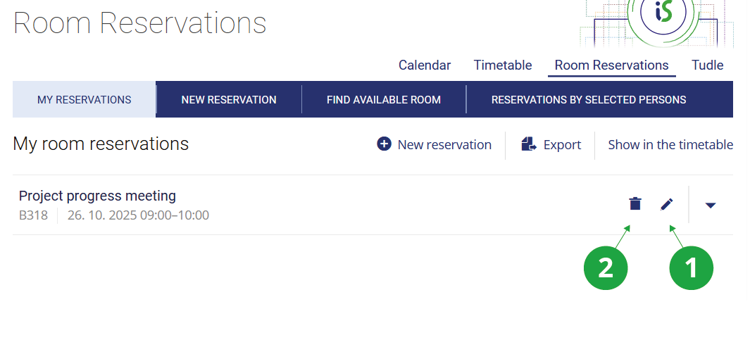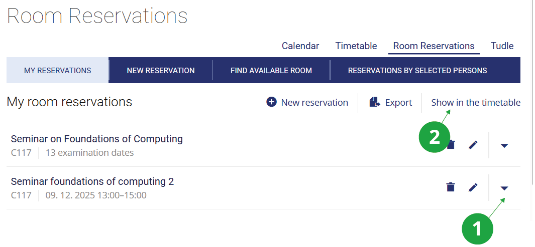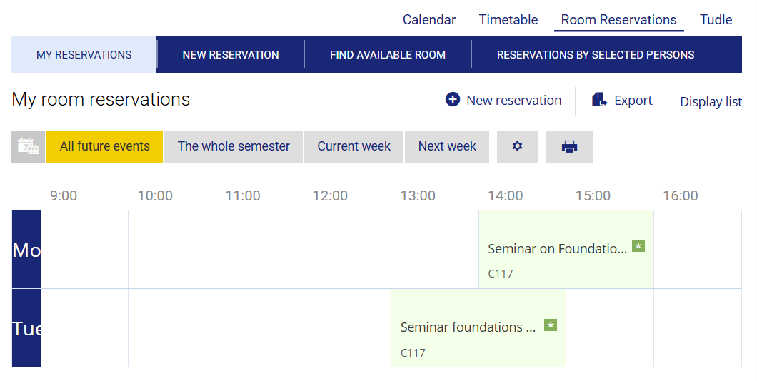 Users can view their reservations in a list and also graphically in the timetable. However, the timetable view depends on the semester selected (in the top-right corner of the Information System page). If the user cannot see their reservation in the timetable, they should check whether they have selected the correct semester.