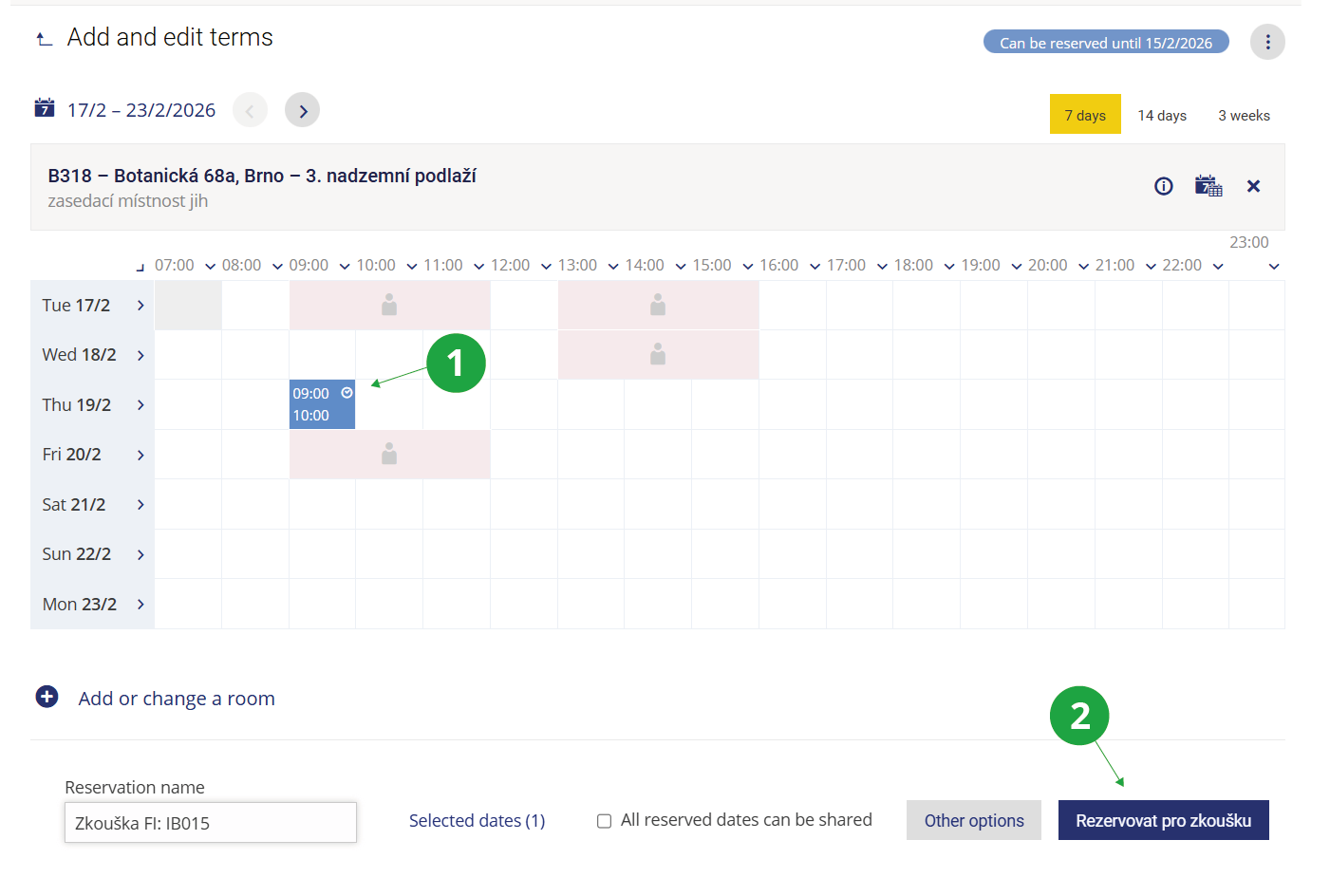 2 Clicking “Rezervovat pro zkoušku” creates the reservation and allows the teacher to specify further details of the exam.