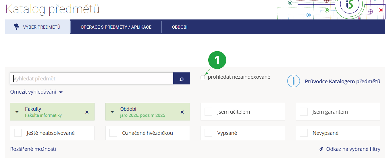 - Předměty, které jsou označeny „nevypsat“, se studentům nenabídnou k registraci a zápisu a nebudou zobrazeny v Prohlídce katalogu.